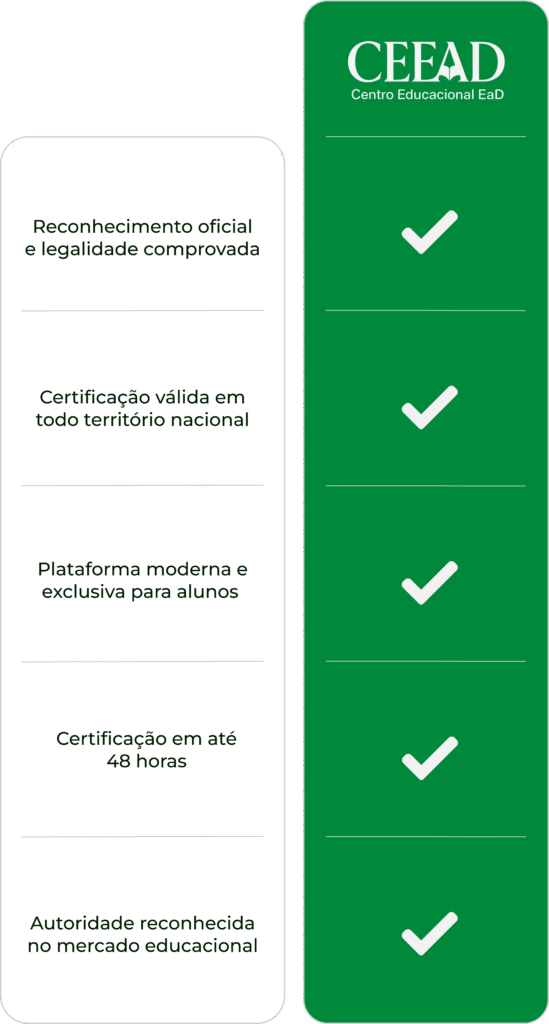 Todos os cursos oferecidos pela CEEAD são reconhecidos oficialmente, assegurando qualidade e credibilidade na sua formação. Os certificados possuem validade em todo o território nacional e permitem a devida atribuição junto aos conselhos profissionais, em conformidade com a legislação vigente.